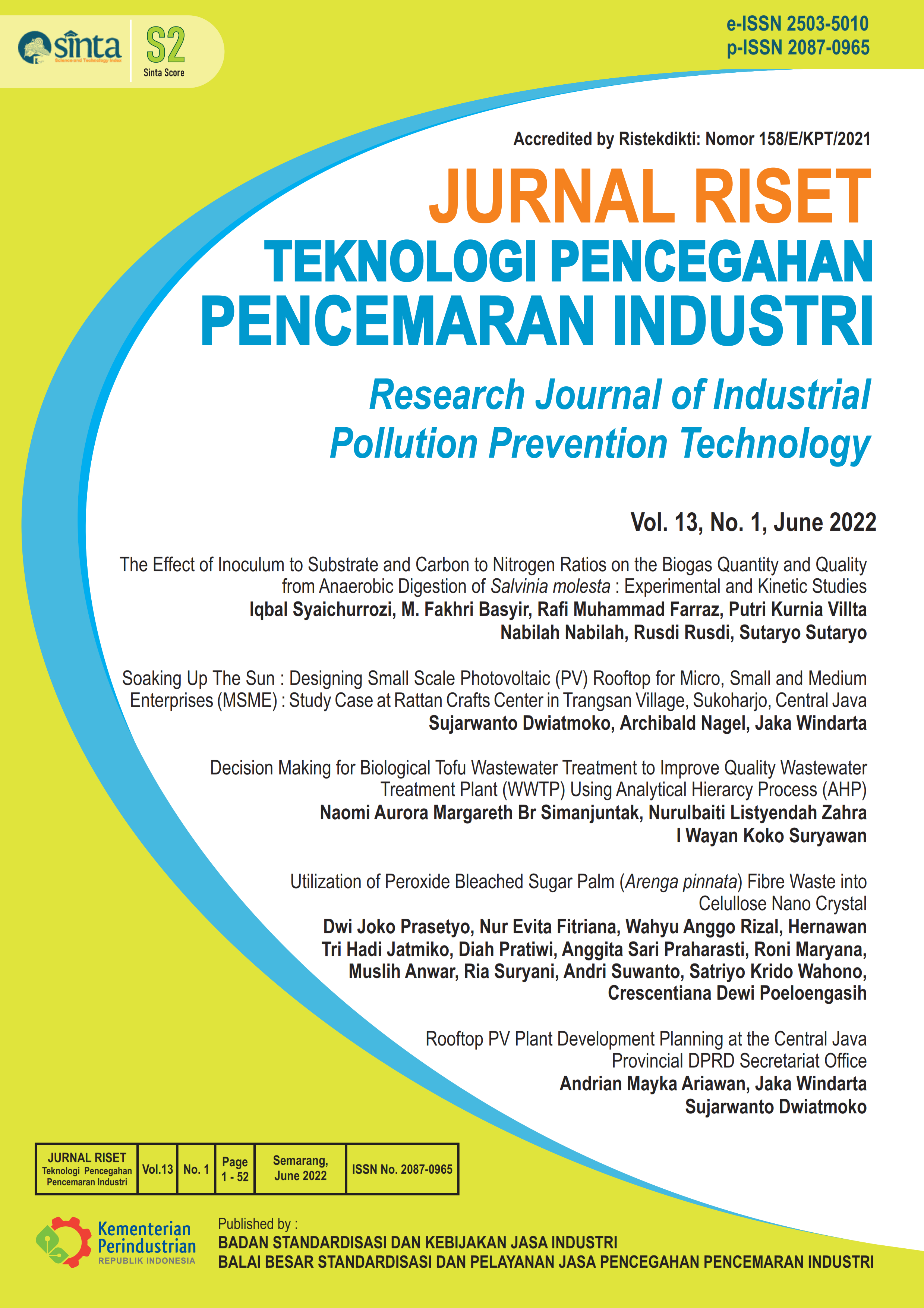 Printed edition of Jurnal Riset Teknologi Pencegahan Pencemaran Industri, available online since March 31th 2016, this is quick submitted issue, original archive can be seen here.